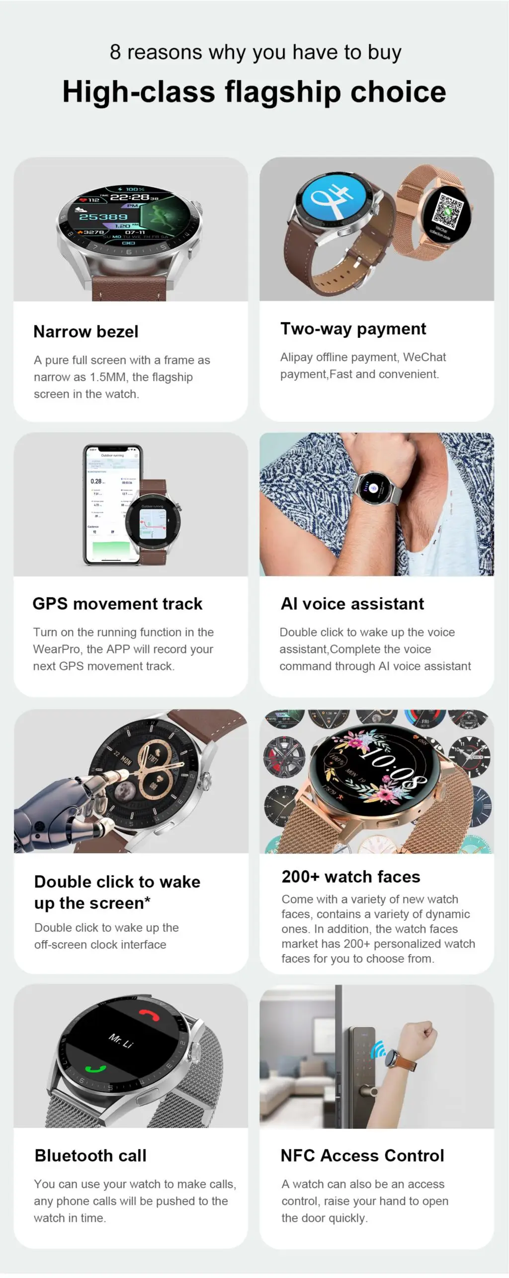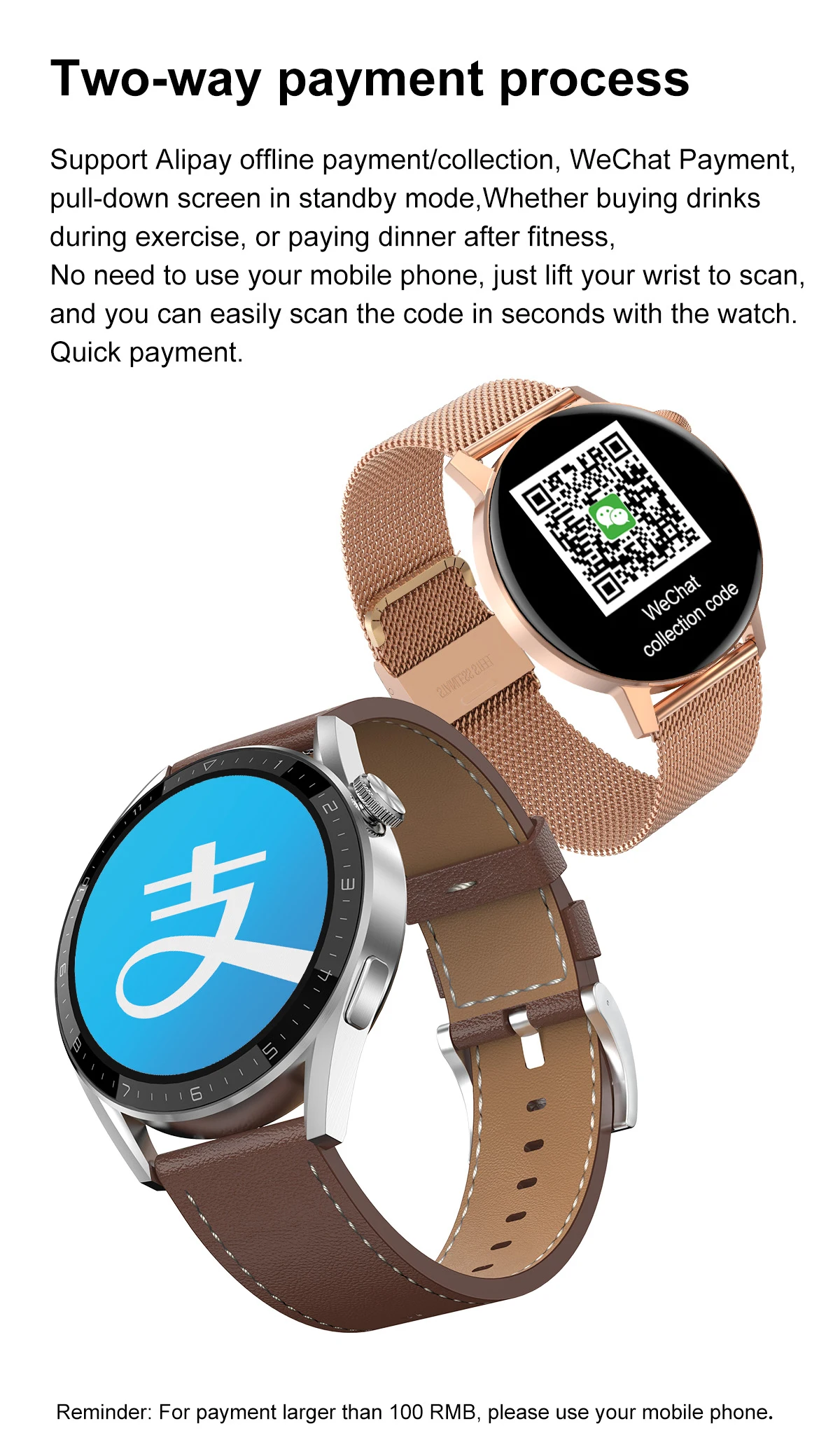 1. The NFC of this watch only supports as IC door cards with a frequency of 13.56MNZ (applicable to 80% on the market), does not support other functions.